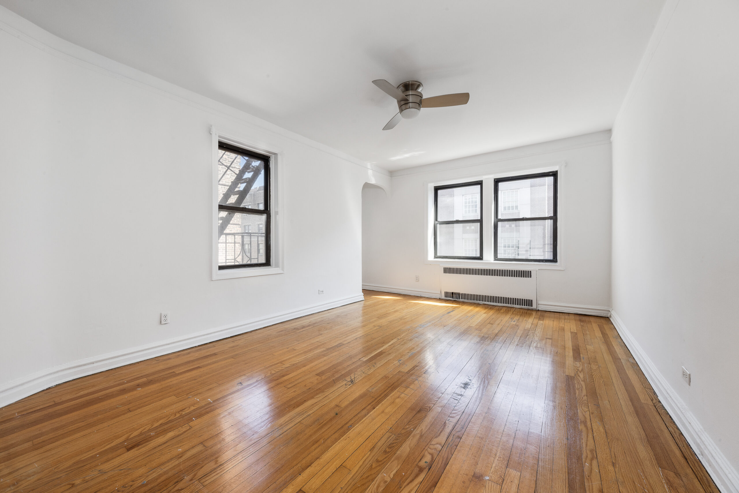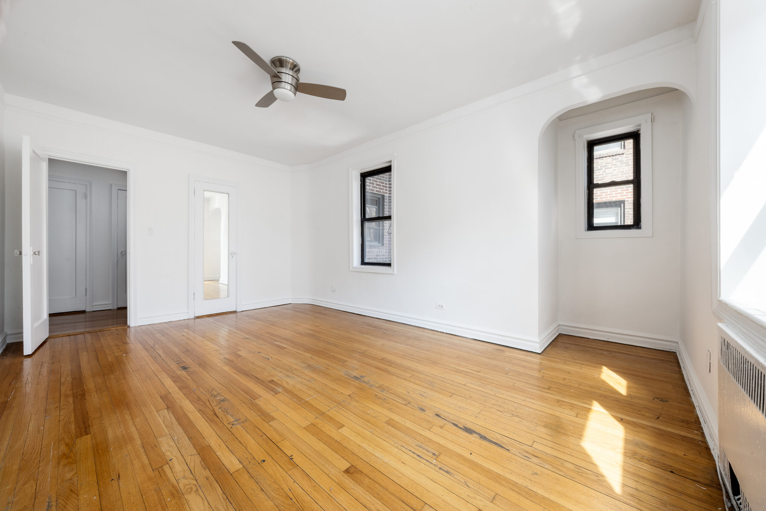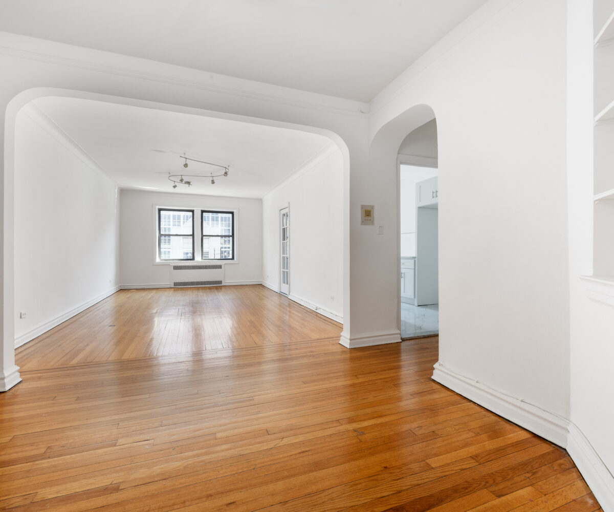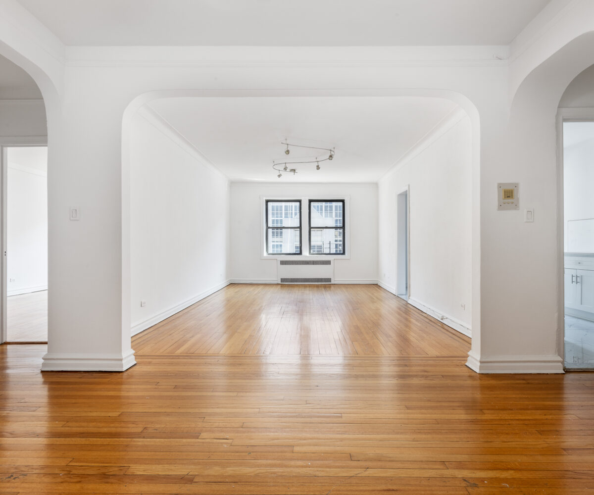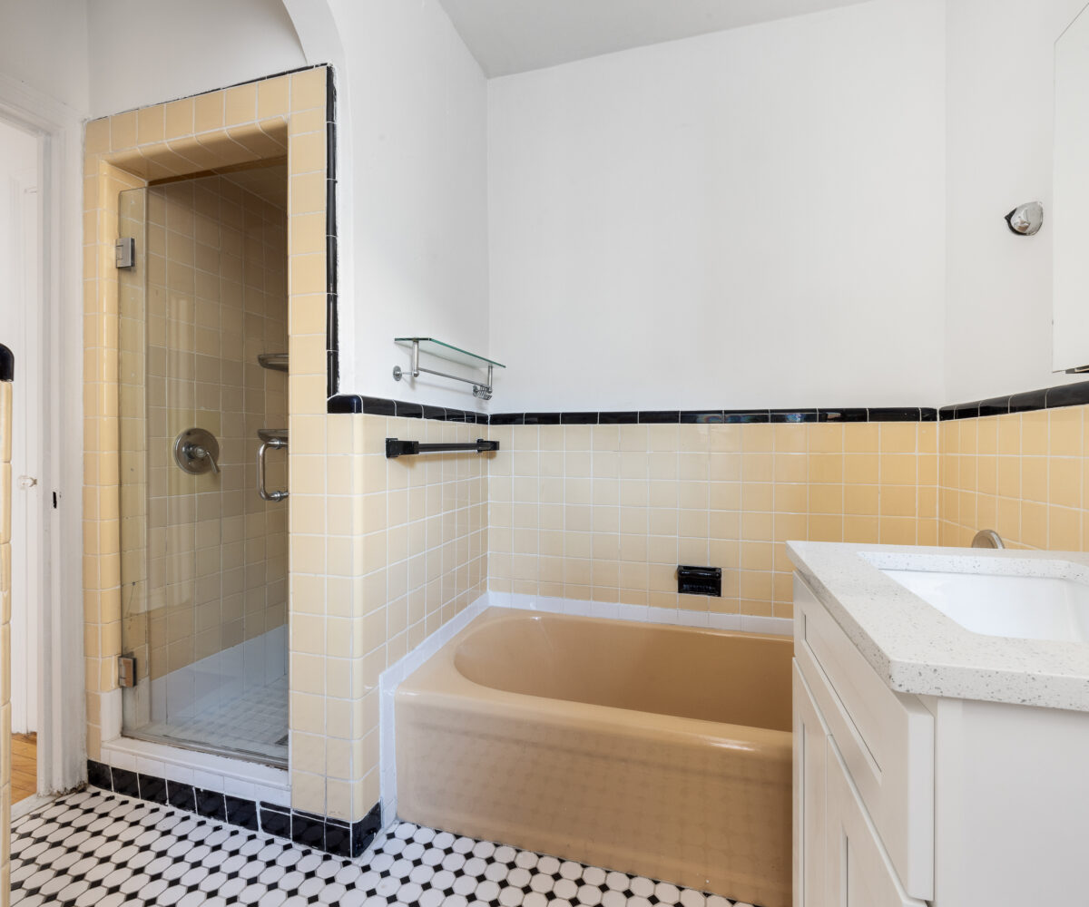 Anchored by original hardwood floors and framed by sculpturesque arches, this highly functional and grand layout offers a formal dining area, a spacious living room, a living-room-size corner bedroom with an additional windowed alcove, tiled bath with a standing shower and soaking tub, as well as a newly updated windowed eat-in kitchen.