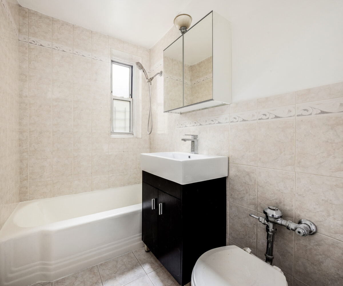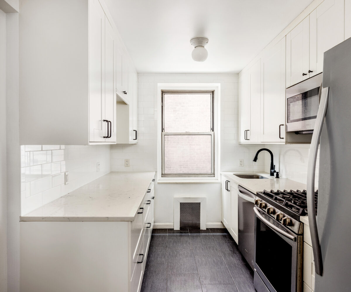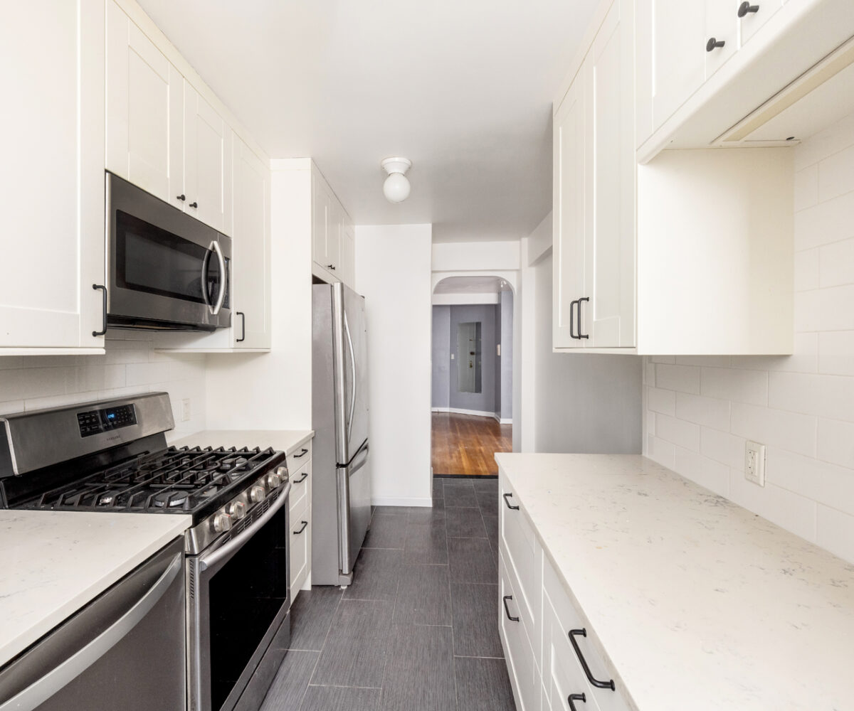 The fully renovated windowed eat-in kitchen features custom shaker cabinets, stone counters, a full line of stainless-steel appliances, complete with a dishwasher, ample storage, under-cabinet lighting, and quality finishes. The bathroom is tiled in classic ceramic tile and finished with quality fixtures.
