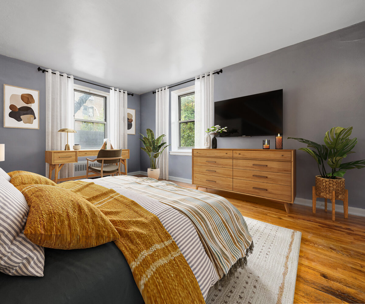 The main living room has ample windows and is adjoined by the foyer, which can double as a dining room. Spanning two exposures, the bedroom offers ample space for a king-size bed and an office/seating area.
